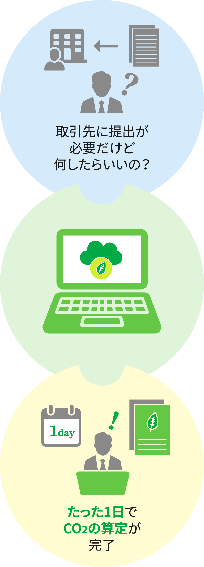 CO2排出量の算定・見える化から、サプライチェーンを含む削減策のご提案までを一気通貫でサポートします。